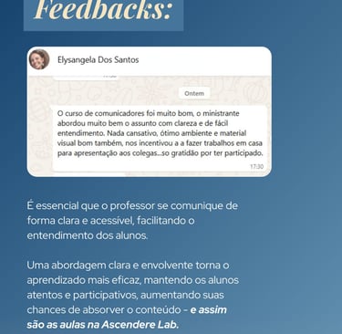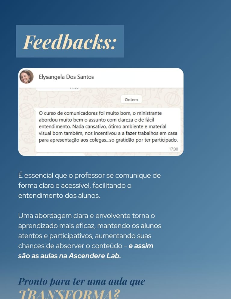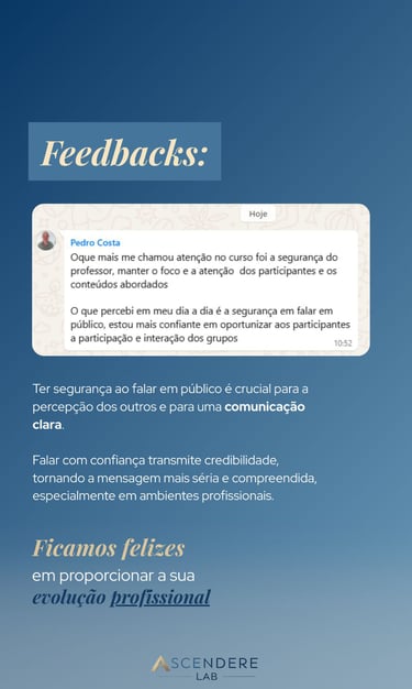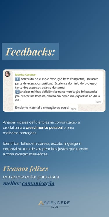O diferencial da Ascendere Lab está na combinação entre técnica e autoconhecimento: não basta apenas aprender a falar bem, é preciso desenvolver autoconfiança, presença e autenticidade. Além disso, cada módulo foi estruturado em sequência lógica para facilitar a evolução do aluno, sempre com práticas reais, feedbacks e exercícios que consolidam o aprendizado.